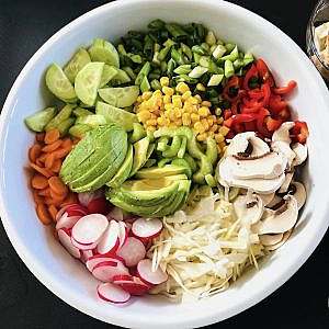 - Assemble the Bowls and start arranging prepared ingredientsArrange microgreens, radishes, carrots, avocado, peppers, onions, cucumber, mushrooms, celery, corn, and cabbage around the rice.