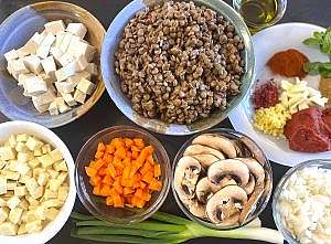 - In a large pot or skillet, heat olive oil and butter. Sauté the chopped onion until soft and translucent.Add garlic, ginger, carrots, sweet potato, and mushrooms. Cook for 5–6 minutes, stirring occasionally.Stir in tomato paste, paprika, cumin, and pink peppercorns. Cook for 1–2 minutes to release flavors.Add lentils, tofu cubes, and broth or water. Mix well and bring to a gentle simmer.Let the stew cook for 15–20 minutes until the vegetables are tender and the flavors meld. Add more liquid if you prefer a soupier consistency.Season with salt and pepper. Garnish with fresh green onions and mint before serving.