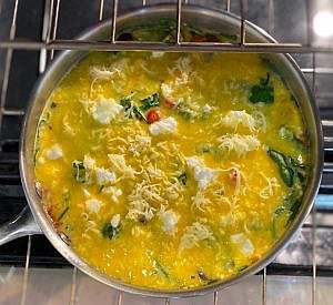 3. Combine with egg mixture: Pour the egg mixture evenly over the sautéed vegetables in the skillet. Gently place chunks of feta cheese on top without pressing them into the eggs. Sprinkle the grated mozzarella cheese evenly over the top.
