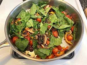 Add the spinach and tomatoes: Add the fresh spinach and cherry tomatoes to the skillet. Cover the skillet briefly (about 1 minute) to allow the spinach to wilt slightly.